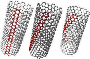 カーボンナノチューブ(CNT)はフラーレン(C60分子)と並んで、流行のナノテクの代表みたいなものだ。ようはダイヤモンド、グラファイト、フラーレンに続くC(炭素)の結晶構造なのだが円筒(チューブ)状なのが特徴。 フラーレンは1985年、CNTは19991年に発見される。発見したのは当時NECの研究員だった飯島 澄男さんという方。第一報はNatureに掲載された。 CNTにも結晶構造に色々な種類があり構造によって導体になったり、半導体になったりするために幅広い分野で注目されている。