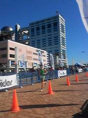 Bike→RunのトランジットはBIKEはフリーラック。RUN用品はかごの中にはいっている。RUNはお台場のプロムナードの上を4周回するコース。フジテレビ、自由の女神、ゆりかもめなどの脇を走る。ものすごい観客の数で興奮する。 出だしからBIKEで使いすぎたのか足が重く出遅れる。1周目の後半から2周目前半にかけて調子が上がってきたと思ったら足が攣ってしまったが何とかごまかして走る。 スピードは上がらず… それにしても応援が凄い。 うちの大学の応援団は間違いなくTopの人数。どこにいても応援してもらえる。 プロ選手よりも応援されていると感じる。 後半の橋を渡ってフジテレビの横を自由の女神方向に向かうところは特にゾクゾクきた。 こんなところでレースを出来るというのはなんて幸せなんだろう、と改めて感動。 ヒロトミくんとは今回もまたBIKEを含めずっと一緒にレースを展開してきました。