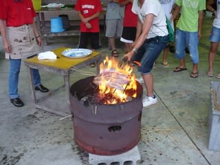 写真はかつおのたたきを作っているところ。わらで焼いて火力を上げ表面のみを焼くというのがおいしさの秘訣。