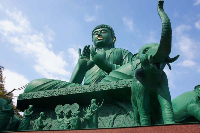 自分が生まれる2年前の昭和62年に開眼した緑の大仏様はいつ見ても迫力あり。時期が時期なのか蚊に悩まされて早々と退散しましたが参道から山門、L字型に進んで2つ目の赤の山門のところそして菱形におかれた飛び石など雰囲気がとても好きな場所です。