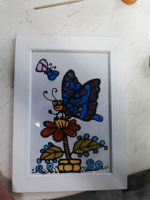 栃木県の宇都宮大学工学部の木村教授がフロントガラスのリサイクルに向けた研究を進め、ガラスの樹脂をエタノールに入れてかき混ぜることで分離することに成功。分離した樹脂を溶液に着色しガラスに塗ったところ、透明性があり凸凹が出る特長がありそれを絵具に商品化したのが生業とのこと。