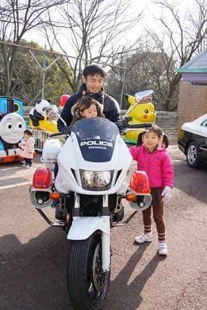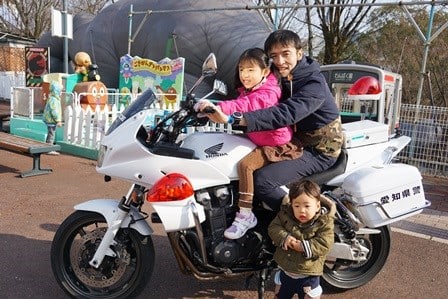 たまたま行ったモンキーパークでJAFのイベントがあり、白バイに乗ることが出来ました。と言ってもまたがっただけですが。