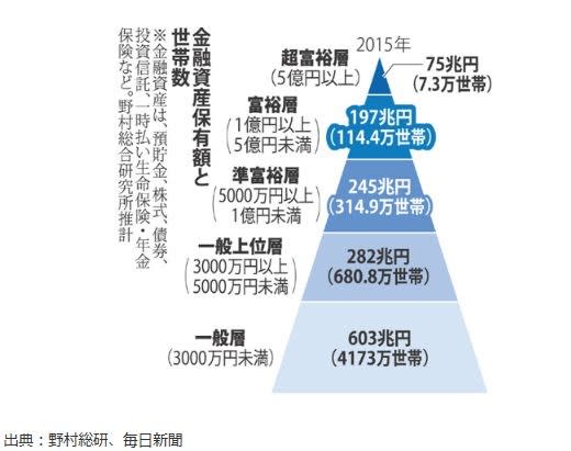 富裕層(全体の2.2%)114.4万世帯で197兆円を保有。金融資産1億円以上5億円未満の世帯