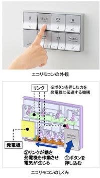 今年の2月に発売されたものですがカチッと押し込む動作で発電し、電波を出す仕組みだそうで従来電気工事が必要 or 電池交換が必要だったトレイのリモコンが「自立」出来るのだそうです。指でスイッチを押すと、リモコン内部で力が伝わりリモコンに内蔵された発電装置の磁石が回転してコイルとの間で「電磁誘導」が発生、結果として電気エネルギーを生み出すという仕組みです。壊れないか心配になってしまいますが250万回程度押すことに耐えられるとのこと。