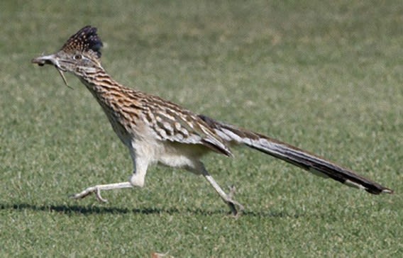 ダチョウや鶏のように飛べない鳥が居るのは当然ですが飛べるのに飛ばない戦略を選んでいる鳥がいるとのことで飛びたい人間にとっては驚きでした。大道走(オオミチバシリ)=ロードランナーはカッコウ目・カッコウ科に分類される鳥で体長は50-60cmほどで、北アメリカ大陸南部の砂漠地帯=アリゾナなどに生息する鳥ですが飛べるのにもかかわらず捕食対象であるトカゲの狩りがしやすいという理由であえて飛ばず~40㎞/hにも到達するスピードで走っているとのことです。足を回転させる速さは0.1秒に1回転という速さで、自分の体長に近いほどの広い歩幅で走っているとのこと。まるで加速という言葉を知らないがごとく行き来するロードランナーですが走ってかつまるでスイッチが入っているがごとくStop/Goを繰り返すことが出来るのが大きな特徴。