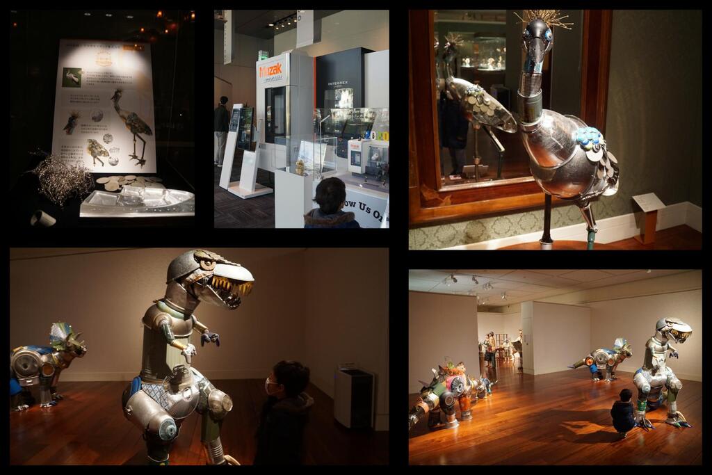 新栄の山崎マザック美術館で開催されている富田菜摘さんの廃材を用いたアート「スクラップワールド」へ行ってきました。5階の常設展は素通りでしたが子供の目的だった恐竜群(ティラノサウルス、トリケラトプス、ステゴサウルス)をばっちり鑑賞。廃材を使ったどこかレトロでシュールな作品群を観てきました。今回特別展の行われている4階はもともと価値のある家具、調度品などが展示されているのですが不思議とその中に溶け込むように77点の作品が展示されており、美術品に昇格した廃材と根っからの美術品というコントラストが面白いところです。アンディウォホールの洗剤のコピーを木箱に張り付けただけの作品「ブリロ・ボックス」が芸術とは何かを問いかけてくれたようにいわばゴミであってもゴミでない世界をまざまざ見せつけてくれた作品でした。恐竜の胴体には扇風機の外枠の網、口の中にはドライヤー、手の爪にはPSのコントローラなどなど…そしてティラノには「ティラ」などとすべての作品に愛着ある名前が付けられています。 今回、山崎マザックの工場から出た廃材を使った作品= カンムリヅルの「マーサ」 が最後に展示されていてこれまた廃材が良い質感を出していて工業製品のゴミに対する価値を見直させてくれます。まさに工業部品の末の廃材のアッセンブリ=組み立てされた作品が工作機械の美術館にいるというのはなんかシュールな感じ好きになりました。