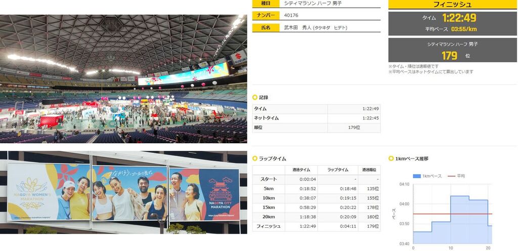 特に10㎞過ぎがなんだか体的に苦しく苦しく若干、登りということもあったのですがペースをかなり落としてしまっていました。ただ15㎞付近以降はやや気持ちが復活という感じで大きなダウンは無かったのですがそれでもなお22分を切ることが出来ないでいる状況でした。この距離だと3:45/㎞をキープしたいところですがやはり筋持久力が足りない=長時間練習が出来ていないことでどうも持たないのと4:00/㎞以下のペースの。 今年はミドルTAにも出たいのでもう少し練習方法にカツを入れたいと思います。