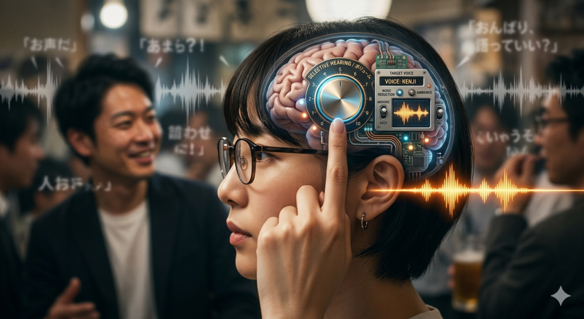 人間が騒がしい場所で特定の声を聞き分ける「カクテルパーティー効果」の仕組みを、AIモデルを用いて解明した研究です。特定の音の特徴(ピッチや場所など)を強調する「特徴量ゲイン(feature gains)」という仕組みがあることが神経生理学ではすでに分かっていますがこれをニューラルネットワークで再現。まずモデルはターゲットとなる声(キュー)を聞いてその特徴を記憶します。その後、混ざり合った音の中から、その特徴に合致する信号を強調(ゲインをかける)して、言葉を認識させるということで人間の動きを模倣するというよりは上記のタスクに対して最適化を実施したとのこと。ただ結果としては人間と同じような機能性の取得と「後期選択:人間の脳では情報の処理が進んだ後半の段階で重要な音が選別される」が再現されたとのこと。人間の「注意して聞き耳を立てる」という戦略が、選択的な聴取というタスクを効率的に遂行しようと最適化する過程で、自然に発生するものであることを再現できたということができそうです。